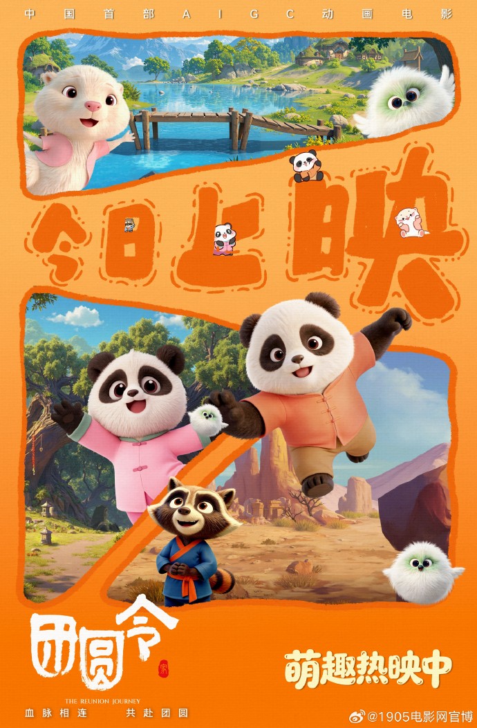 中国首部AIGC动画电影《团圆令》今日正式登陆全国院线,并发布"今日上映"海报。 这部以赠台大熊猫"团团""圆圆"为原型的动画电影,讲述熊猫兄妹"团仔"与"圆妞"因意外离散后,哥哥团仔为寻找妹妹踏上跨越山海的冒险之旅,集齐五行之力守护家园的温情故事。影片将东方美学与前沿AI技术深度融合,为观众呈现一场关于亲情与成长的视觉盛宴。